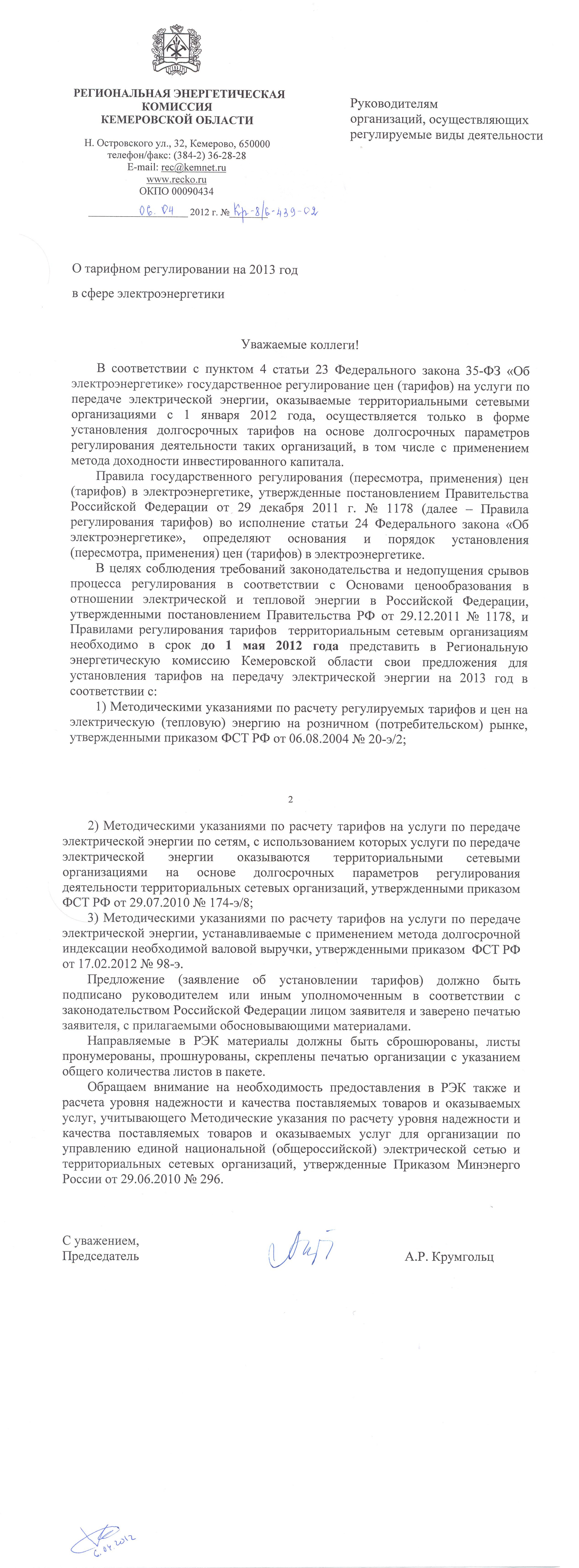 В соответствии с пунктом 4 статьи 23 Федерального закона 35-ФЗ «Об электроэнергетике» государственное регулирование цен (тарифов) на услуги по передаче электрической энергии, оказываемые территориальными сетевыми организациями с 1 января 2012 года, осуществляется только в форме установления долгосрочных тарифов на основе долгосрочных параметров регулирования деятельности таких организаций, в том числе с применением метода доходности инвестированного капитала. Правила государственного регулирования (пересмотра, применения) цен (тарифов) в электроэнергетике, утвержденные постановлением Правительства Российской Федерации от 29 декабря 2011 г. № 1178 (далее – Правила регулирования тарифов) во исполнение статьи 24 Федерального закона «Об электроэнергетике», определяют основания и порядок установления (пересмотра, применения) цен (тарифов) в электроэнергетике. В целях соблюдения требований законодательства и недопущения срывов процесса регулирования в соответствии с Основами ценообразования в отношении электрической и тепловой энергии в Российской Федерации, утвержденными постановлением Правительства РФ от 29.12.2011 № 1178, и Правилами регулирования тарифов территориальным сетевым организациям необходимо в срок до 1 мая 2012 года представить в Региональную энергетическую комиссию Кемеровской области свои предложения для установления тарифов на передачу электрической энергии на 2013 год в соответствии с: 1) Методическими указаниями по расчету регулируемых тарифов и цен на электрическую (тепловую) энергию на розничном (потребительском) рынке, утвержденными приказом ФСТ РФ от 06.08.2004 № 20-э/2; 2) Методическими указаниями по расчету тарифов на услуги по передаче электрической энергии по сетям, с использованием которых услуги по передаче электрической энергии оказываются территориальными сетевыми организациями на основе долгосрочных параметров регулирования деятельности территориальных сетевых организаций, утвержденными приказом ФСТ РФ от 29.07.2010 № 174-э/8; 3) Методическими указаниями по расчету тарифов на услуги по передаче электрической энергии, устанавливаемые с применением метода долгосрочной индексации необходимой валовой выручки, утвержденными приказом ФСТ РФ от 17.02.2012 № 98-э. Предложение (заявление об установлении тарифов) должно быть подписано руководителем или иным уполномоченным в соответствии с законодательством Российской Федерации лицом заявителя и заверено печатью заявителя, с прилагаемыми обосновывающими материалами. Направляемые в РЭК материалы должны быть сброшюрованы, листы пронумерованы, прошнурованы, скреплены печатью организации с указанием общего количества листов в пакете. Обращаем внимание на необходимость предоставления в РЭК также и расчета уровня надежности и качества поставляемых товаров и оказываемых услуг, учитывающего Методические указания по расчету уровня надежности и качества поставляемых товаров и оказываемых услуг для организации по управлению единой национальной (общероссийской) электрической сетью и территориальных сетевых организаций, утвержденные Приказом Минэнерго России от 29.06.2010 № 296.