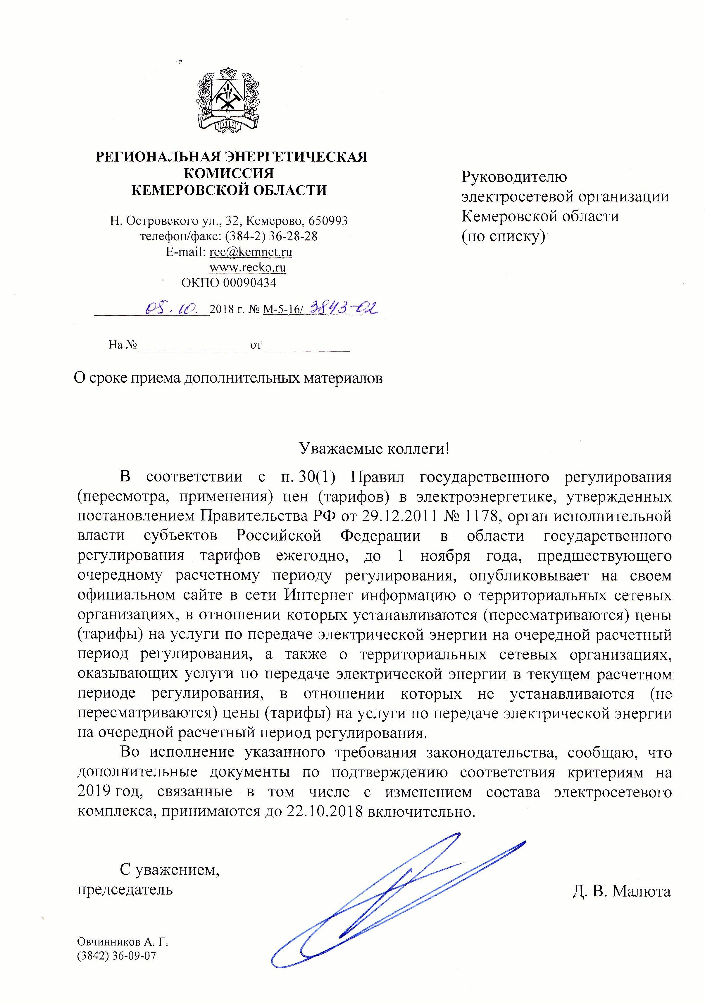 В соответствии с п. 30(1) Правил государственного регулирования (пересмотра, применения) цен (тарифов) в электроэнергетике, утвержденных постановлением Правительства РФ от 29.12.2011 № 1178, орган исполнительной власти субъектов Российской Федерации в области государственного регулирования тарифов ежегодно, до 1 ноября года, предшествующего очередному расчетному периоду регулирования, опубликовывает на своем официальном сайте в сети Интернет информацию о территориальных сетевых организациях, в отношении которых устанавливаются (пересматриваются) цены (тарифы) на услуги по передаче электрической энергии на очередной расчетный период регулирования, а также о территориальных сетевых организациях, оказывающих услуги по передаче электрической энергии в текущем расчетном периоде регулирования, в отношении которых не устанавливаются (не пересматриваются) цены (тарифы) на услуги по передаче электрической энергии на очередной расчетный период регулирования. Во исполнение указанного требования законодательства, сообщаю, что дополнительные документы по подтверждению соответствия критериям на 2019 год, связанные в том числе с изменением состава электросетевого комплекса, принимаются до 22.10.2018 включительно.
